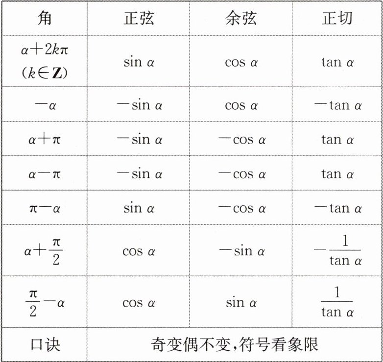 | $\alpha + 2k\pi (k \in \mathbf{Z})$ | $\sin \alpha$ | $\cos \alpha$ | $\tan \alpha$ |