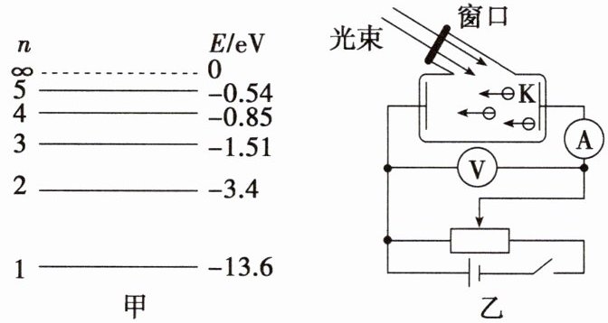 针对练2.(多选)氢原子的部分能级图如图甲所示,大量处于n=4激发态的氢原子向低能级跃迁时能辐射出不同频率的光,用这些光照射如图乙所示的光电管阴极K,阴极材料是逸出功为2.25eV的金属钾。已知可见光光子的能量范围为1.62~3.11eV,则下列说法正确的是 (