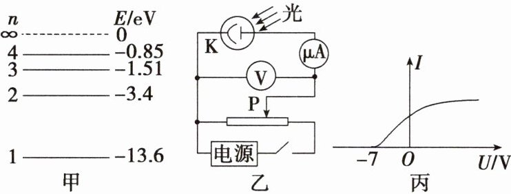 例2(多选)(2025·河北唐山市高二联考)如图甲为氢原子的能级图,大量处于n=4激发态的氢原子跃迁时,发出频率不同的大量光子,其中频率最高的光子照射到图乙电路中光电管阴极K上时,电路中电流随电压变化的图像如图丙所示。下列说法正确的是 (