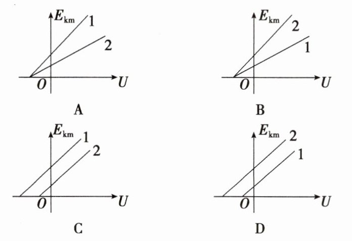 针对练2.(2021·江苏高考)如图所示,分别用1、2两种材料作K极进行光电效应探究,其截止频率$ν_1<ν_2,$保持入射光不变,则光电子到达A极时动能的最大值E_km随电压U变化关系的图像是(