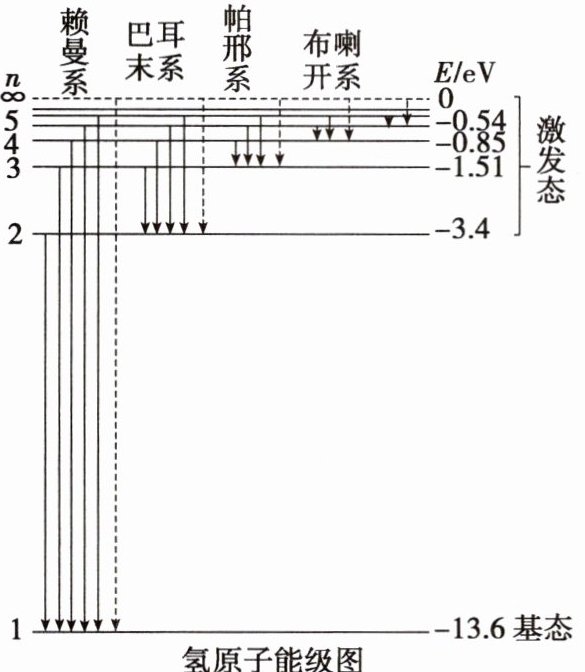 真题2 BD 氢原子$n = 3$与$n = 2$的能级差小于$n = 4$与$n = 2$的能级差,则$H_a$与$H_B$相比,$H_a$的波长大、频率小,故A错误,B正确;$H_B$对应的光子能量为$E = (-0.85) eV - (-3.4) eV = 2.55 eV$,故C错误;氢原子从基态跃迁到激发态至少需要能量$E = (-3.4) eV - (-13.6) eV = 10.2 eV$,$H_B$对应的光子不能使氢原子从基态跃迁到激发态,故D正确。