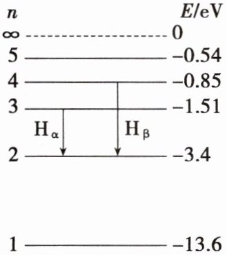 参考下图,用玻尔理论解释,当巴耳末公式n=5时计算出的氢原子光谱的谱线,是哪两个能级之间的跃迁造成的?