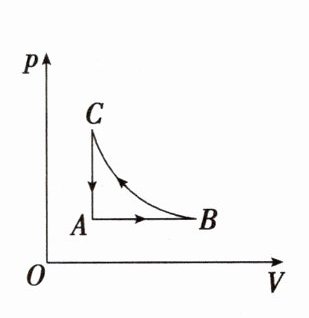 2.AC 由题图可知A→B是等压膨胀过程,即$V_B>V_A$,由盖 - 吕萨克定律可知$\frac{V_A}{T_A}=\frac{V_B}{T_B}$,所以$T_B>T_A$,即温度升高;B→C是等温压缩过程,即$V_B>V_C$,$p_C>p_B$,即压强变大;C→A是等容降压过程,即$p_C>p_A$,由查理定律可知$\frac{p_C}{T_C}=\frac{p_A}{T_A}$,所以$T_C>T_A$,即温度降低。故选AC。