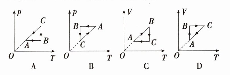 针对练2.(多选)一定质量的气体的状态变化过程如图中A→B→C→A 图线所示,其中 B→C 为一段双曲线。若将这一状态变化过程表示在选项图中的 p-T 图像或 V-T 图像上,其中正确的是 (