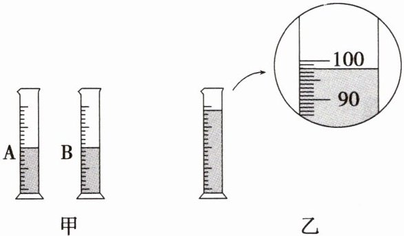 【情境导入】 向A、B两个量筒中分别倒入50mL的水和酒精(如图甲),然后再将A量筒中的水倒入B量筒中,观察混合后液体的体积变化情况(如图乙)。
