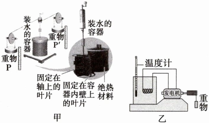 任务1.隔绝与外界热量的交换,使水温度的升高只由叶片搅拌引起。任务2.图甲所示的实验中,重物下落,减少的机械能转化为系统的内能;图乙所示的实验中,重物带动发电机工作,将机械能转化为电能,电热丝又将电能转化为系统的内能。