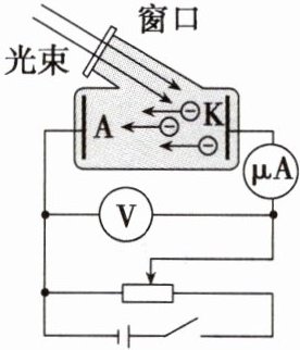 A 调节滑动变阻器滑片,当电压表的示数为5.0V时,电流表的示数恰好为零,可知光电子的最大初动能$E_k = eU_c = 5eV = 8.0×10^{-19}J,$故A正确;根据爱因斯坦光电效应方程$E_k = hν - W_0,$得逸出功$W_0 = hν - E_k = 7eV = 1.12×10^{-18}J,$故B错误;若用光子能量为8eV的光束照射阴极K,8eV大于阴极K的逸出功,所以能发生光电效应应产生光电子,故C错误;将电源的正负极对调,把滑动变阻器的滑片向右滑动,当电流表示数不再增加时,此时电流表的示数为饱和电流,故D错误。