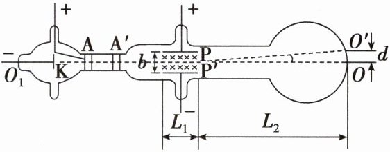 例1 如图为 J.J. 汤姆孙用来测定电子比荷的装置。当极板 P 和 P' 间不加偏转电压时,电子束打在荧光屏的中心 O 点处,形成一个亮点;加上偏转电压 U 后,亮点偏离到 O' 点,O' 点到 O 点的竖直距离为 d,水平距离可忽略不计;此时在 P 与 P' 之间的区域里再加上一个方向垂直于纸面向里的匀强磁场,调节磁感应强度,当其大小为 B 时,亮点重新回到 O 点。已知极板水平方向长度为 L₁,极板间距为 b,极板右端到荧光屏的距离为 L₂。
