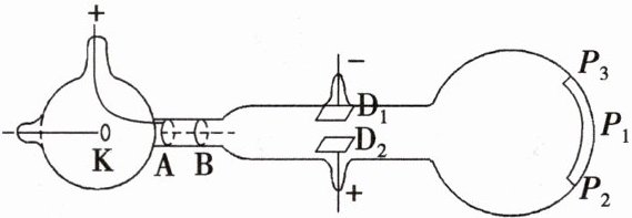 任务1.K、A部分产生阴极射线。 任务2.阴极射线向下偏转,与电场方向相反,说明阴极射线带负电。 任务3.由左手定则可得,在金属板D₁、D₂之间单独加垂直纸面向外的磁场,可以让阴极射线向上偏转。