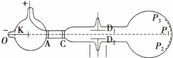 例2 J.J. 汤姆孙测定电子比荷(电子的电荷量与质量之比)的实验装置如图所示。真空玻璃管内,阴极 K 发出的电子经加速后,穿过小孔 A、C,沿中心轴线 OP₁ 以速度 v 进入两块水平正对放置的极板 D₁、D₂ 间,射出后到达右端的荧光屏上形成光点。若极板 D₁、D₂ 间无电压,电子将打在荧光屏上的中心 P₁ 点。现在极板间加上竖直方向、电场强度大小为 E 的匀强电场后,电子向上偏转;再在极板间施加一个方向垂直于纸面的匀强磁场(图中未画出),电子在荧光屏上产生的光点又回到了 P₁ 点;接着去掉电场,电子向下偏转,射出极板时偏转角为 θ。已知极板的长度为 L,忽略电子的重力及电子间的相互作用。求: