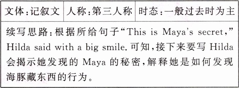 续写思路:根据所给句子“This is Maya’s secret,”Hilda said with a big smile. 可知,接下来要写 Hilda 会揭示她发现的 Maya 的秘密,解释她是如何发现海豚藏东西的行为。
