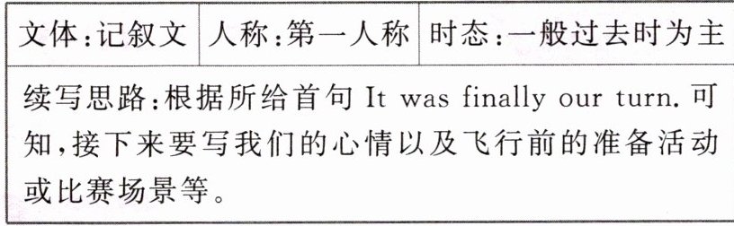 续写思路:根据所给首句It was finally our turn.可知,接下来要写我们的心情以及飞行前的准备活动或比赛场景等。