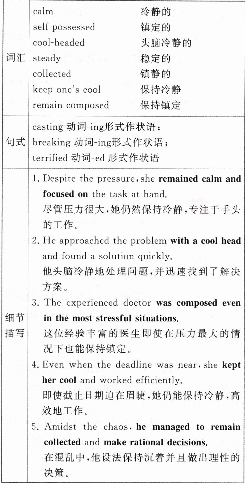 (他挥动着灯笼,投下闪烁的影子在豹子的眼睛周围飞舞;casting动词-ing形式作状语). The animal’s gaze never left Mohan, but the light seemed to make it hesitate. (2)Mohan’s heart beat violently in his chest,but he forced himself to stay calm