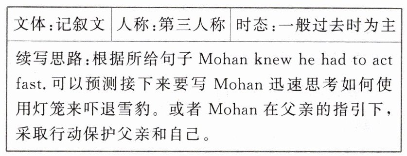 (2025·广东联考·读后续写)Mohan兴奋地得知自己可以和父亲一起去牧羊→他们和其他牧羊人一起,带着羊群进入山区牧场,准备在那里待六个月→Mohan和父亲及邻居Kishan带着羊群向北走→晚上,Mohan发现父亲的羊群跑下山坡,意识到出事了→Mohan决定去找父亲,让Sona留下保护羊群→Mohan拿着灯笼和牧羊棍去找父亲,发现父亲和一只羔羊在沟里,而一只雪豹正盯着他们→……