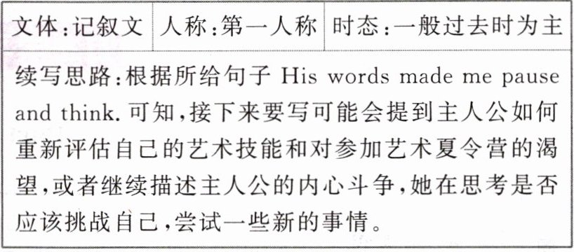 续写思路:根据所给句子 His words made me pause and think.可知,接下来要写可能会提到主人公如何重新评估自己的艺术技能和对参加艺术夏令营的渴望,或者继续描述主人公的内心斗争,她在思考是否应该挑战自己,尝试一些新的事情。