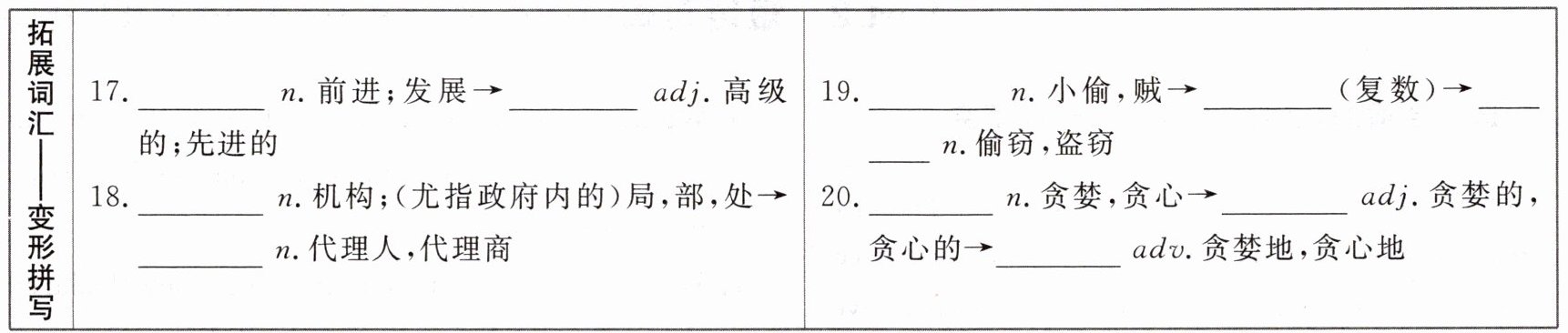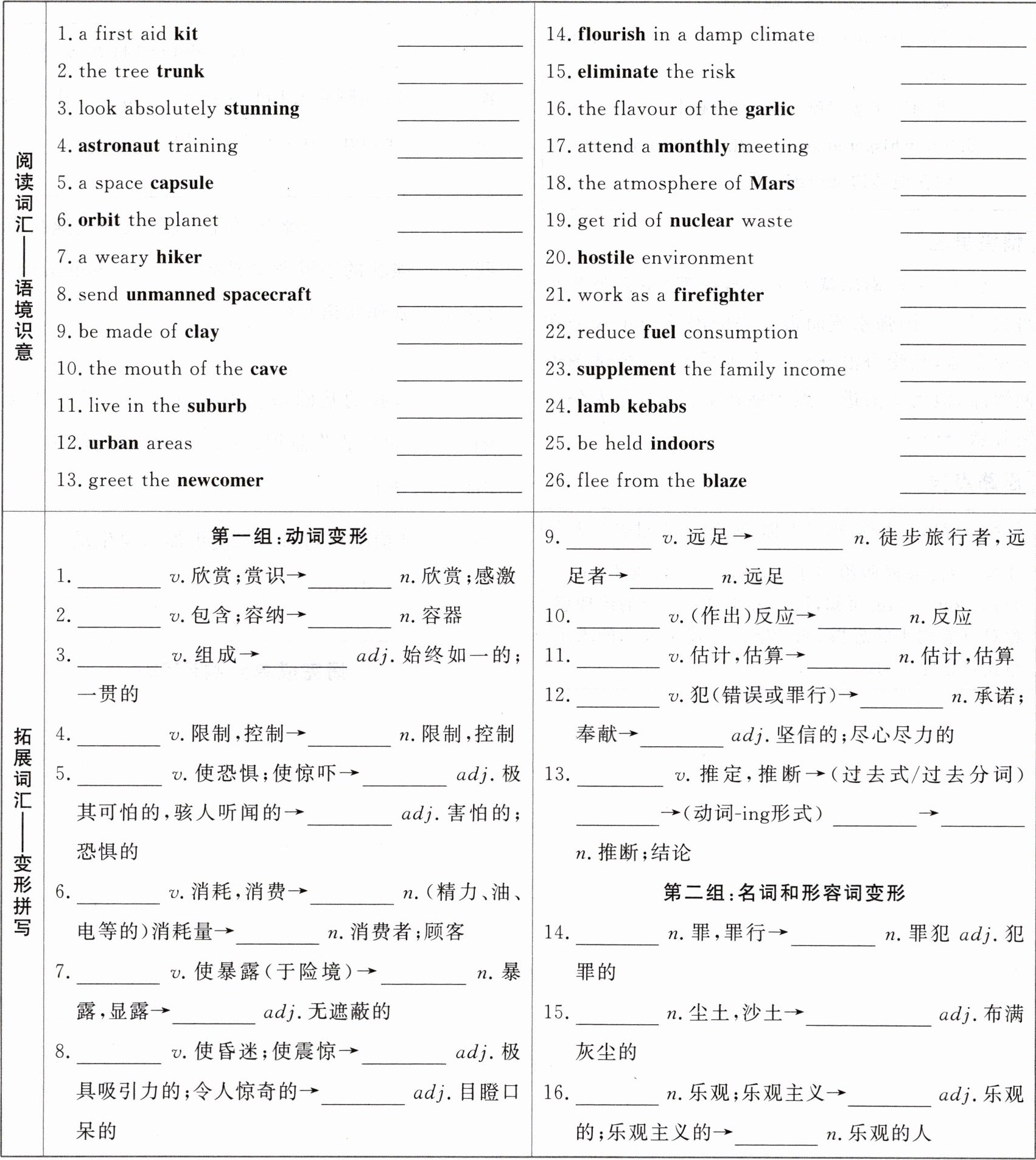 Part 1 单元词汇·分类自测 阅读词汇——语境识意 1.一套急救用品 2.树干 3.看上去极具吸引力 4.宇航员训练 5.一个太空舱 6.环绕行星运行 7.一个疲惫的徒步旅行者 8.发射无人驾驶宇宙飞船 9.用黏土制成 10.洞口 11.住在郊区 12.城镇地区 13.问候新来者 14.在潮湿的气候下生长茂盛 15.消除风险 16.大蒜的味道 17.参加每月一次的会议 18.火星的大气环境 19.处理核废料 20.恶劣的环境 21.作为一名消防队员 22.降低燃料消耗 23.增加家庭收入 24.烤羊肉串 25.在室内进行 26.从大火中逃出 拓展词汇——变形拼写 1.appreciate;appreciation 2.contain;container 3.consist;consistent 4.restrict;restriction 5.terrify;terrifying;terrified 6.consume;consumption;consumer 7.expose;exposure;exposed 8.stun;stunning;stunned 9.hike;hiker;hiking 10.react;reaction 11.estimate;estimation 12.commit;commitment;committed 13.infer;inferred;inferring;inference 14.crime;criminal 15.dust;dusty 16.optimism;optimistic;optimist 17.advance;advanced 18.agency;agent 19.thief;thieves;theft 20.greed;greedy;greedily