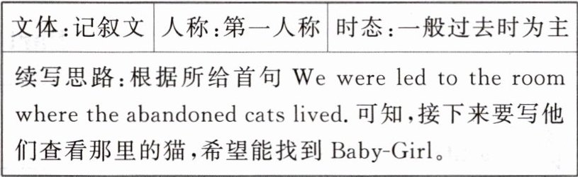 续写思路 根据所给首句We were led to the room where the abandoned cats lived.可知,接下来要写他们查看那里的猫,希望能找到Baby-Girl。