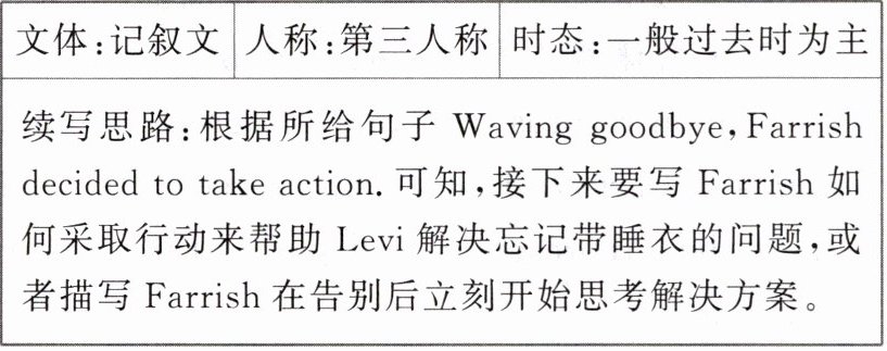 续写思路:根据所给句子 Waving goodbye,Farrish decided to take action.可知,接下来要写 Farrish 如何采取行动来帮助 Levi 解决忘记带睡衣的问题,或者描写 Farrish 在告别后立刻开始思考解决方案。