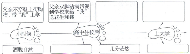 1. 用较快的速度默读上文,想一想,文章以“父亲的泥脚”为线索,描写了哪些场景?作者的感受有哪些变化?用简洁的语言概括。