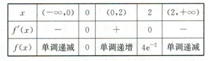 (2)函数的定义域为$D=(-\infty,+\infty)$.因为$f'(x)=(x^{2})'e^{-x}+x^{2}(e^{-x})'=2xe^{-x}-x^{2}e^{-x}=e^{-x}·(2x - x^{2})$,令$f'(x)=0$,由于$e^{-x}>0$,所以$x_{1}=0$,$x_{2}=2$.用$x_{1}$,$x_{2}$分割定义域$D$,得下表.