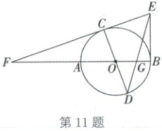11. (2025·泸州)如图,$AB$,$CD$是$\odot O$的直径,过点$C$的直线与过点$B$的切线交于点$E$,与$BA$的延长线交于点$F$,且$EB=EC$,连接$DE$交$AB$于点$G$.