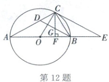 12. (2025·新疆)如图,$AB$为$\odot O$的直径,$C$为$\odot O$上一点,$CF\perp AB$于点$F$,$\angle FCE=2\angle A$,$BD// CE$交$CF$于点$G$,交$AC$于点$D$.
