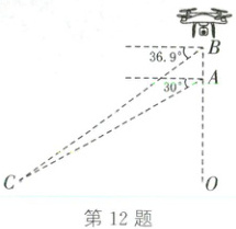 12. (2025·广安)随着科技的发展,无人机在实际生活中应用广泛。如图,$O$,$C$是同一水平线上的两点,无人机从点$O$竖直上升到点$A$,在点$A$测得点$C$的俯角为$30^{\circ}$,$A$,$C$两点的距离为$24m$。无人机继续竖直上升到点$B$,在点$B$测得点$C$的俯角为$36.9^{\circ}$。求无人机从点$A$到点$B$的上升高度$AB$(结果精确到$0.1m$,点$O$,$A$,$B$,$C$在同一平面内,参考数据:$\sin36.9^{\circ}\approx0.60$,$\cos36.9^{\circ}\approx0.80$,$\tan36.9^{\circ}\approx0.75$,$\sqrt{3}\approx1.73$)。