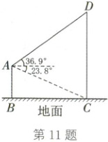 11. (2025·安徽)某公司为庆祝新产品上市,在甲楼与乙楼的楼顶之间悬挂彩带营造喜庆气氛。如图,甲楼和乙楼分别用与水平地面垂直的线段$AB$和$CD$表示,彩带用线段$AD$表示。工作人员在点$A$处测得点$C$的俯角为$23.8^{\circ}$,测得点$D$的仰角为$36.9^{\circ}$。已知$AB = 13.20m$,求$AD$的长(结果精确到$0.1m$,参考数据:$\sin23.8^{\circ}\approx0.40$,$\cos23.8^{\circ}\approx0.91$,$\tan23.8^{\circ}\approx0.44$,$\sin36.9^{\circ}\approx0.60$,$\cos36.9^{\circ}\approx0.80$,$\tan36.9^{\circ}\approx0.75$)。