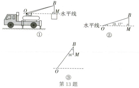 13. (2025·凉山)如图①,某型号起重机吊起一货物$M$在空中保持静止状态时,货物$M$与点$O$的连线$MO$恰好平行于地面,其示意图如图②所示,其中$BM = 3$米,$\angle BOM = 18.17^{\circ}$(参考数据:$\sin18.17^{\circ}\approx0.31$,$\cos18.17^{\circ}\approx0.95$,$\tan18.17^{\circ}\approx0.33$,$\sin36^{\circ}\approx0.59$,$\cos36^{\circ}\approx0.81$,$\tan36^{\circ}\approx0.73$)。