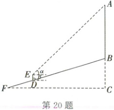 20. (2025·陕西)小涵和小宇想测量公园山坡上一个信号杆的高度。在征得家长同意后,他们带着工具前往测量。测量示意图如图所示,他们在坡面$FB$上的点$D$处安装测角仪$DE$,测得信号杆顶端$A$的仰角$\alpha$为$45^{\circ}$,$DE$与坡面的夹角$\beta$为$72.5^{\circ}$,又测得点$D$与信号杆底端$B$之间的距离$DB$为$22m$。已知$DE = 1.7m$,点$A$,$B$,$C$在同一条直线上,$AB$,$DE$均与水平线$FC$垂直。求信号杆的高$AB$(参考数据:$\sin72.5^{\circ}\approx0.95$,$\cos72.5^{\circ}\approx0.30$,$\tan72.5^{\circ}\approx3.17$)。