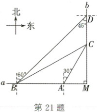 21. (2025·长沙)如图,某景区内两条互相垂直的道路$a$,$b$交于点$M$,景点$A$,$B$在道路$a$上,景点$C$在道路$b$上。为了进一步提升景区品质,景区管委会在道路$b$上又开发了风景优美的景点$D$。经测得景点$C$位于景点$B$的北偏东$60^{\circ}$方向上,位于景点$A$的北偏东$30^{\circ}$方向上,景点$B$位于景点$D$的南偏西$45^{\circ}$方向上。已知$AB = 800m$。求: