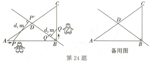24. (2025·苏州)两个智能机器人在如图所示的$Rt\triangle ABC$区域工作,$\angle ABC = 90^{\circ}$,$AB = 40m$,$BC = 30m$,直线$BD$为生产流水线,且$BD$平分$\triangle ABC$的面积(即$D$为$AC$的中点)。机器人甲从点$A$出发,沿$A\rightarrow B$的方向以$v_1m/min$的速度匀速运动,其所在位置用点$P$表示,机器人乙从点$B$出发,沿$B\rightarrow C\rightarrow D$的方向以$v_2m/min$的速度匀速运动,其所在位置用点$Q$表示。两个机器人同时出发,设机器人运动的时间为$t\ min$,记点$P$到$BD$的距离(即垂线段$PP'$的长)为$d_1m$,点$Q$到$BD$的距离(即垂线段$QQ'$的长)为$d_2m$。当机器人乙到达终点时,两个机器人立即同时停止运动,此时$d_1 = 7.5$。$d_2$与$t$的部分对应数值如下表($t_1 < t_2$):