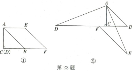 (2)如图②,点$D$,$F$都在线段$BC$的延长线上,用等式表示$DF$与$BC$的数量关系,并证明。