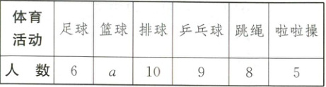 41. (2025·南通)为了提升学生的体质健康水平,促进学生全面发展,某校在大课间开展了 6 项体育活动,每名学生报名参与其中一项活动.为了解该校学生参与大课间体育活动情况,该校随机抽取了 50 名学生进行调查,得到如下未完成的统计表.