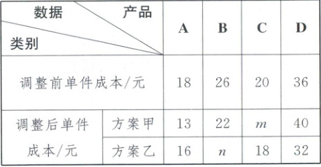 54. (2025·河北)某工厂生产 A,B,C,D 四种产品.为提升产品的竞争力,该工厂计划对部分种类的产品优化生产流程,降低成本;对其他种类的产品增加研发投入,提升品质.经研究,该工厂做出了甲、乙两种调整方案,这两种方案将对四种产品的成本产生不同的影响.