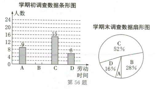 56. (2025·湖北)为加强劳动教育,学校制定了《劳动习惯养成计划》,实施“家校社”联动行动,引导学生参与家务劳动、公益劳动等实践活动.学校在学期初和学期末分别对七年级学生开展了“一周参与劳动时间”的问卷调查,两次调查均随机抽取50名学生.根据收集到的数据,将劳动时间$x$(单位:h)分为A($x<2$),B($2\leqslant x<3$),C($3\leqslant x<4$),D($x\geqslant4$)四组进行统计,并绘制了学期初调查数据条形图,学期末调查数据扇形图和两次调查数据的平均数、中位数、众数统计表,部分信息如下.