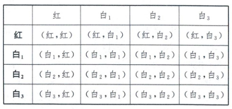 (2) 记 3 个白球为白$_{1}$, 白$_{2}$, 白$_{3}$. 根据题意,列表如下: