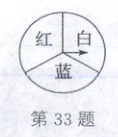33. (2025·甘肃)如图所示为一个可以自由转动的转盘,转盘被等分成3个扇形,分别涂有“红、白、蓝”三种颜色,转盘指针固定.转动转盘,等转盘停止转动后,观察指针所落区域的颜色.若指针落在区域分界线上,则重新转动转盘.