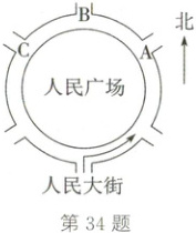 34. (2025·长春)长春市人民广场是中心景观类环岛型交通广场,以开阔的空间、精美的建筑和多彩的绿化而驰名.如图,甲、乙两辆车从人民大街由南向北驶入人民广场,它们各自从A,B,C三个出口中随机选择一个出口驶出.用画树状图(或列表)的方法,求甲、乙两辆车从同一出口驶出的概率.