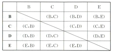由表可知,共有 12 种等可能的结果,其中恰好选中 D,E 两门课程的结果有(D,E),(E,D),共 2 种, $\therefore$ 恰好选中 D,E 两门课程的概率为$\frac{2}{12}=\frac{1}{6}$