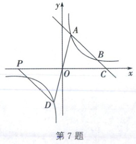 7. (2025·眉山)如图,一次函数$y = ax + b$与反比例函数$y = \frac{k}{x}$的图象相交于$A(1,4)$,$B(4,m)$两点,与x轴交于点C,点D与点A关于点O对称,连接AD。