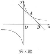 8. (2025·成都)如图,在平面直角坐标系中,直线$y = - x + b$与反比例函数$y = \frac{k}{x}$的图象的一个交点为$A(a,2)$,与x轴的交点为$B(3,0)$。