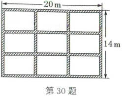30.设小路的宽度为$x$m,则9个矩形地块可合成长为$(20 - 4x)$m、宽为$(14 - 4x)$m的矩形。根据题意,得$(20 - 4x) · (14 - 4x) = 24 × 9$。整理,得$2x^2 - 17x + 8 = 0$,解得$x_1 = \frac{1}{2}$,