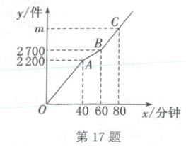 17. (2025·长春)随着我国人工智能科技的快速发展,智能机器人已经走进我们的生活.某快递公司使用甲、乙两台不同型号的智能机器人进行快递分拣工作,它们工作时各自的速度均保持不变. 已知某天它们同时开始工作,甲机器人工作一段时间后,停工保养,保养结束后又和乙机器人一起继续工作. 甲、乙两台机器人分拣快递的总数量 $ y $(件)与乙机器人工作时间 $ x $(分钟)之间的函数关系如图所示.