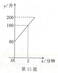 15. (2025·上海)某品牌储水机的容量是 200 升,当加满水时,储水机会自动停止加水,已知加冷水量 $ y $(升)和时间 $ x $(分钟)的图象如图所示,加水过程中,水的温度 $ t $(摄氏度)和时间 $ x $(分钟)的关系为 $ t = \frac{20x + 100}{x + 2} $. 求: