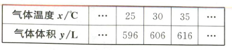 (1)根据题表可知,气体温度升高$1^{\circ}C$,气体体积增大2L,则$y = 596 + 2(x - 25) = 2x + 546$.