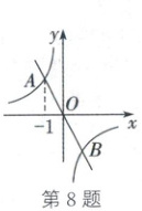 8. (2025·连云港)如图,正比例函数$y = k_1x$($k_1 < 0$)的图象与反比例函数$y = \frac{k_2}{x}$($k_2 < 0$)的图象交于$A$,$B$两点,点$A$的横坐标为$-1$.当$k_1x < \frac{k_2}{x}$时,$x$的取值范围是(