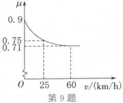 9. (2025·河南)汽车轮胎的摩擦系数是影响行车安全的重要因素之一,在一定条件下,它会随车速的变化而变化.研究发现,某款轮胎的摩擦系数$\mu$与车速$v$($km/h$)之间的函数关系如图所示.下列说法中错误的是(