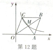 12. (2025·烟台)如图,菱形$OABC$的顶点$A$在$x$轴正半轴上,$OA = 3$,函数$y = \frac{k}{x}$($x > 0$)的图象过点$C$和菱形的对称中心$M$,则$k$的值为(