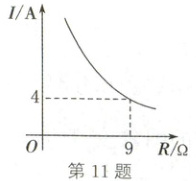 11. (2025·湖北)已知蓄电池的电压为定值,使用蓄电池时,电流$I$(单位:$A$)与电阻$R$(单位:$\Omega$)是反比例函数关系,它的图象如图所示.当电阻大于$9 \Omega$时,电流可能是(